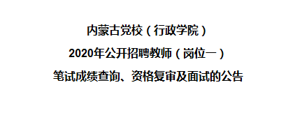 內(nèi)蒙古黨校(行政學(xué)院)2020年公開招聘教師(崗位一)筆試及閱卷工作已經(jīng)結(jié)束,根據(jù)《內(nèi)蒙古黨校(行政學(xué)院)2020年公開招聘教師簡(jiǎn)章》有關(guān)規(guī)定,現(xiàn)將筆試成績(jī)查詢、資格復(fù)審及面試有關(guān)事宜通知如下: ...